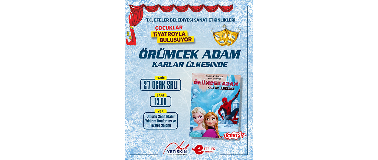 27 Ocak Salı günü saat 13.00’te Umurlu Şehit Mahir Yıldırım Konferans ve Tiyatro Salonu’nda “Örümcek Adam Karlar Ülkesinde” adlı oyun sahnelenecek. Aynı gün saat 15.00’te ise “Ağustos Böceği ile Karınca” oyunu minik izleyicilerle buluşacak.