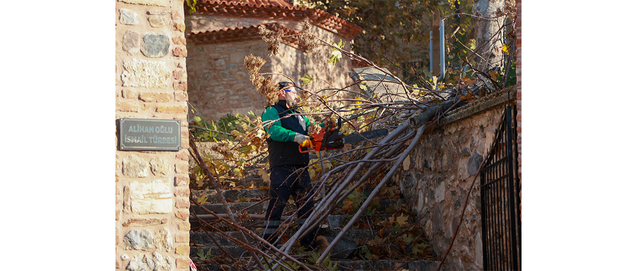 Bu kapsamda Efeler Belediyesi Park ve Bahçeler Müdürlüğü ekipleri, yüzyıllardır Efeler’de manevi bir merkez olarak kabul edilen Alihan Oğlu İsmail Türbesi’nde bakım ve çevre düzenleme çalışması gerçekleştirdi. Türbe bahçesinde bulunan ağaçlar budanırken, uzayan çimler biçilerek alan daha düzenli ve estetik bir görünüme kavuşturuldu.