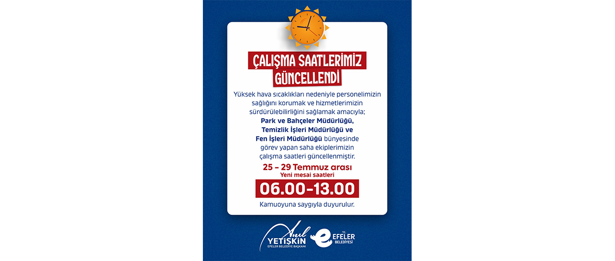 Konuyla ilgili açıklama yapan Efeler Belediye Başkanı Anıl Yetişkin, “Vatandaşlarımıza kesintisiz hizmet sunarken çalışma arkadaşlarımızın sağlığını da gözetmek zorundayız. Özellikle sıcaklığın 40 derecenin üzerine çıktığı bu günlerde, erken saatlerde çalışmak hem ekiplerimizin sağlığı hem de iş verimliliği açısından önem taşıyor. Tüm planlamamızı bu dengeyi sağlayacak şekilde yaptık. Efeler Belediyesi olarak hava koşullarını dikkate alarak gerekli tüm tedbirleri almaya ve vatandaşlarımıza en iyi hizmeti sunmaya devam edeceğiz.” dedi.