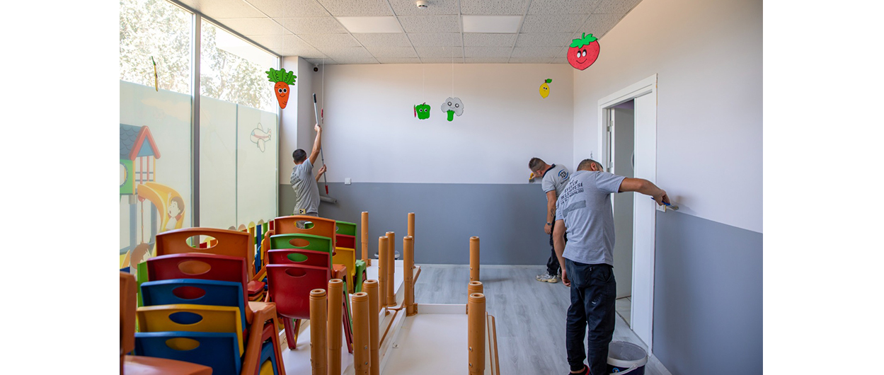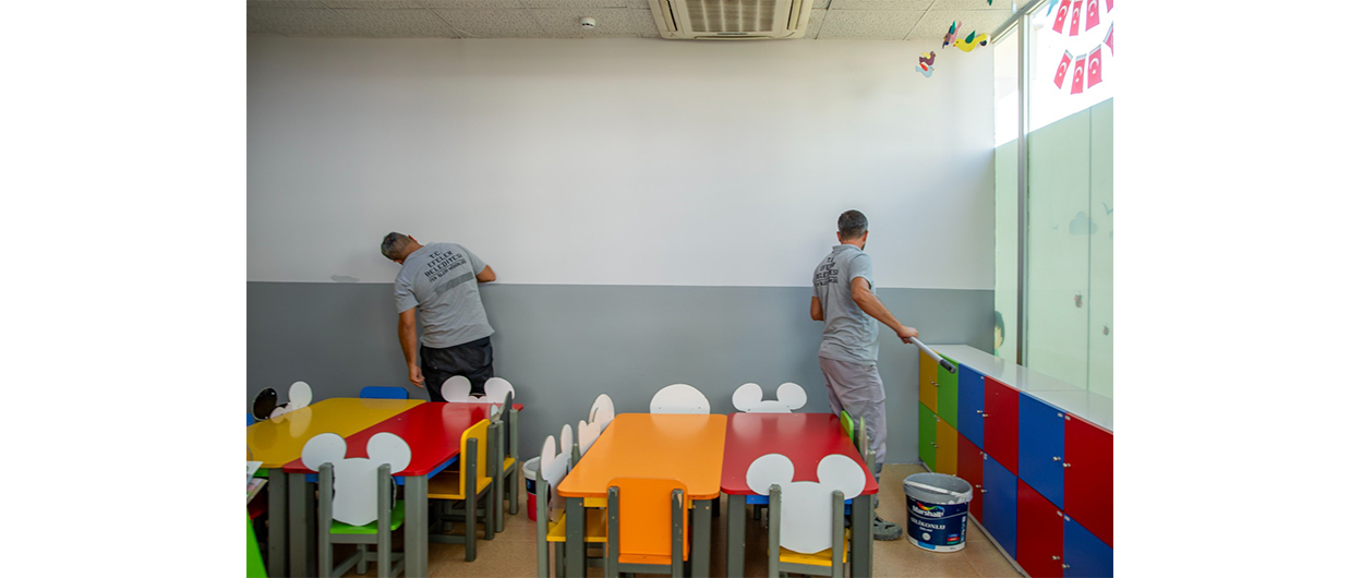 Efeler Belediyesi, çocukların en iyi şartlarda geleceğe hazırlanması amacıyla gündüz bakımevlerinde yeni eğitim-öğretim dönemi öncesi bakım ve onarım çalışmalarını sürdürüyor. Yaz tatili süresince Fen İşleri Müdürlüğü ekipleri tarafından duvarlar boyanıyor, yıpranan alanlar yenileniyor ve merkezler daha ferah, modern bir görünüme kavuşturuluyor.