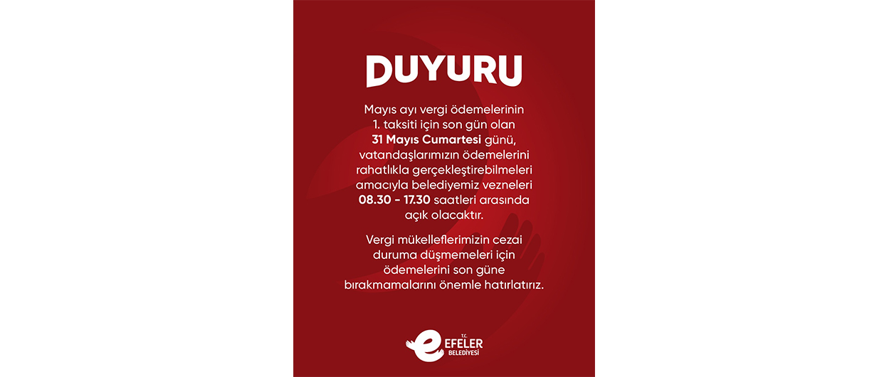 Vatandaş odaklı hizmet anlayışıyla çalışmalarını sürdüren Efeler Belediyesi vergi ödeme sürecinde de kolaylık sağlamaya devam ediyor. Mayıs ayı vergi ödemelerinin birinci taksitinin son günü olan 31 Mayıs Cumartesi günü, belediye vezneleri 08.30 - 17.30 saatleri arasında açık olacak.