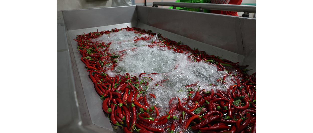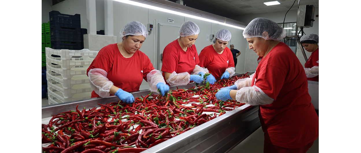 Fabrikada kurutulmuş biber üretimi, hijyen ve kalite standartlarıyla örnek oluşturuyor. Tarladan alınan biberler yıkanıyor, temizleniyor, dilimleniyor ve her aşamada hijyen kurallarına titizlikle uyuluyor.