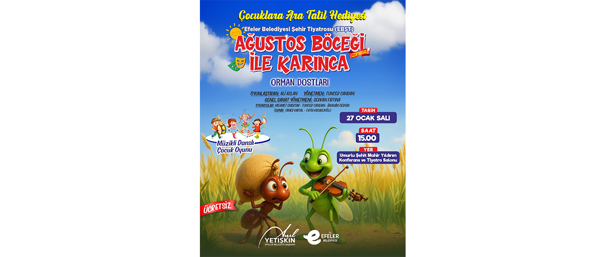 27 Ocak Salı günü saat 13.00’te Umurlu Şehit Mahir Yıldırım Konferans ve Tiyatro Salonu’nda “Örümcek Adam Karlar Ülkesinde” adlı oyun sahnelenecek. Aynı gün saat 15.00’te ise “Ağustos Böceği ile Karınca” oyunu minik izleyicilerle buluşacak.