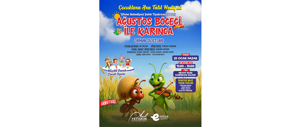 Efeler Belediyesi Şehir Tiyatrosu, minik izleyiciler için hazırladığı eğitici ve eğlenceli oyunlarla perdelerini açıyor. Etkinlikte; çevre bilinci ve doğa sevgisini konu alan “Doğa Dostu Heidi” ile; paylaşma, emek ve dayanışma kavramlarını eğlenceli bir dille anlatan “Ağustos Böceği ile Karınca – Orman Dostları” adlı çocuk oyunları sahnelenecek. Oyunlar, ara tatilde çocuklara hem keyifli hem de öğretici bir tiyatro deneyimi sunmayı hedefliyor.